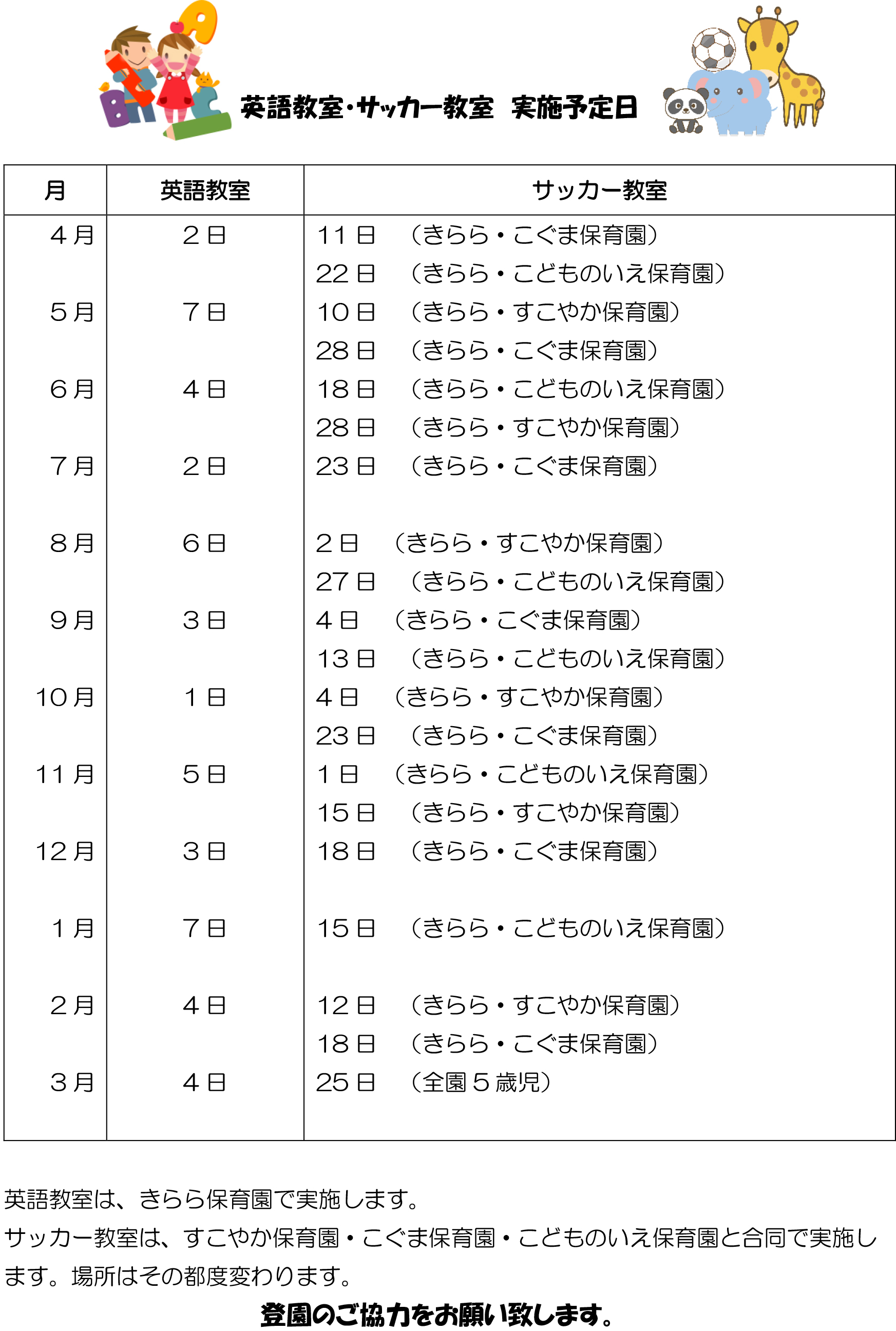 ●誕生会‥月1回実施 ●避難訓練‥月1回実施 ●食育‥月1回 ●サッカー教室・・月2回実施