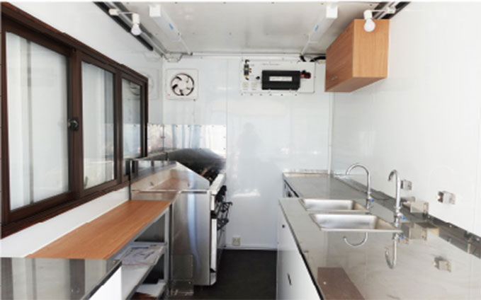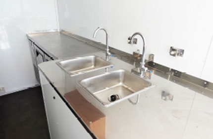 衛生管理を徹底するためにシンクが2つ完備されています。1つは食材や調理器具の洗浄用、もう1つは手洗いや衛生管理用として使用。