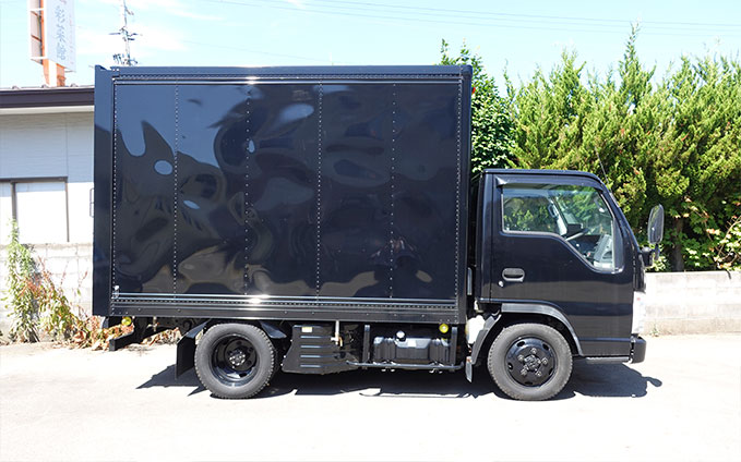 いすゞエルフはベース車両として非常に人気が高いです。車両重量が増えがちなキッチンカーでも制動力、重量耐久力共に信頼性が高いのが特徴です。長距離移動にも安心!